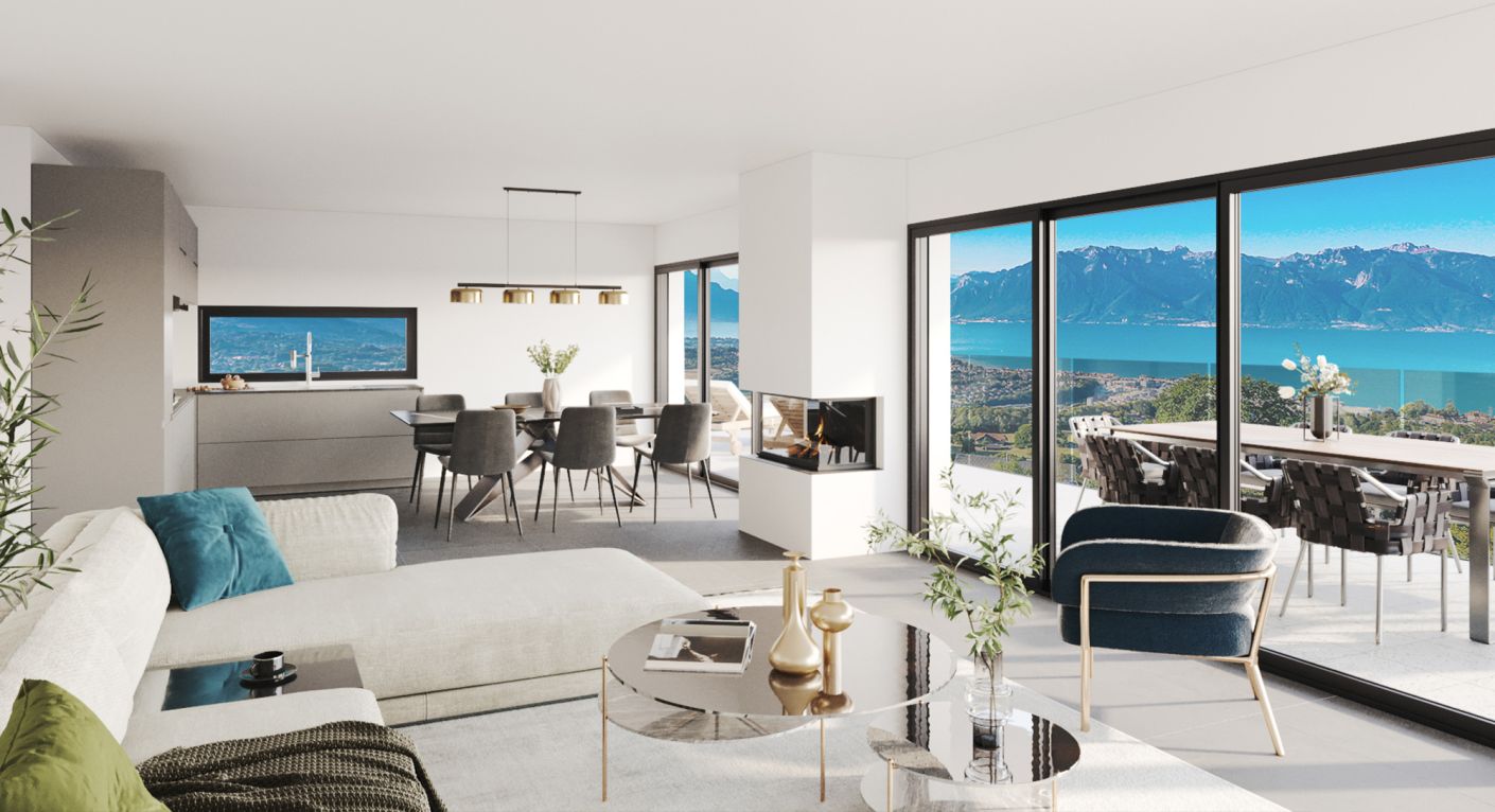 Neuf appartements modernes de standing avec finitions sur mesure, offrant une vue à couper le souffle sur le lac et les montagnes.